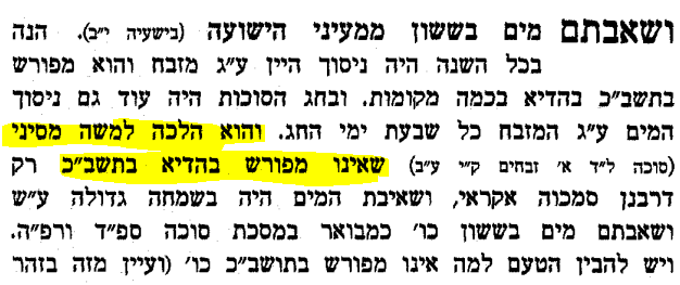 6 – ניסוך המים in general. Mentioned the famous מאמר of the Alter Rebbe 79, 4 delving on the fact that ניסוך המים is not mentioned explicitly in the תורה. This signifies the lofty meaning and idea of ניסוך המים as opposed to ניסוך היין that was performed every day.