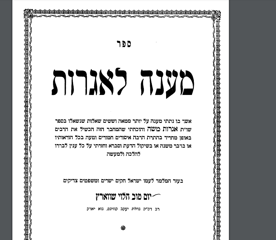 Also discussed the famous (or infamous) book מענה לאגרות by Reb Yom Tov Schwarts who contested many of Reb Moshe’s rulings.