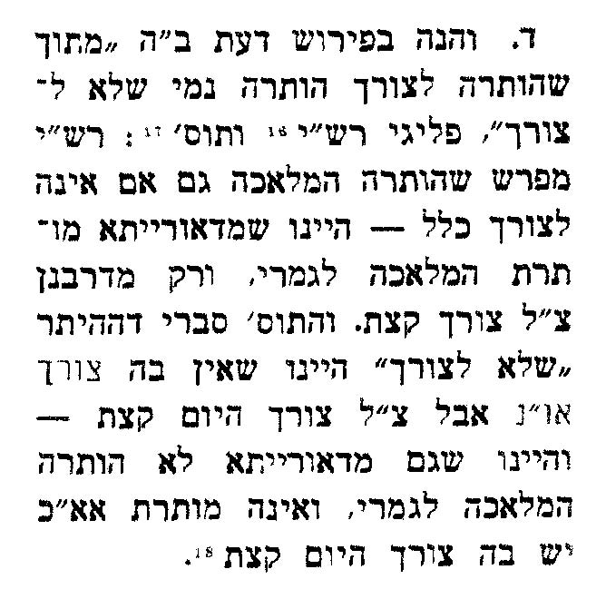 On today’s daf we find that Beis Hillel holds that since carrying is permitted for the purpose of אוכל נפש on Yom Tov, it is also permitted to carry for purposes that have nothing to do with אוכל נפש . This principle is abbreviated as מתוך as is quoted in full above, “Since = מתוך carrying has already been permitted for the purpose of אוכל נפש , it has been permitted for the purpose of non אוכל נפש “.