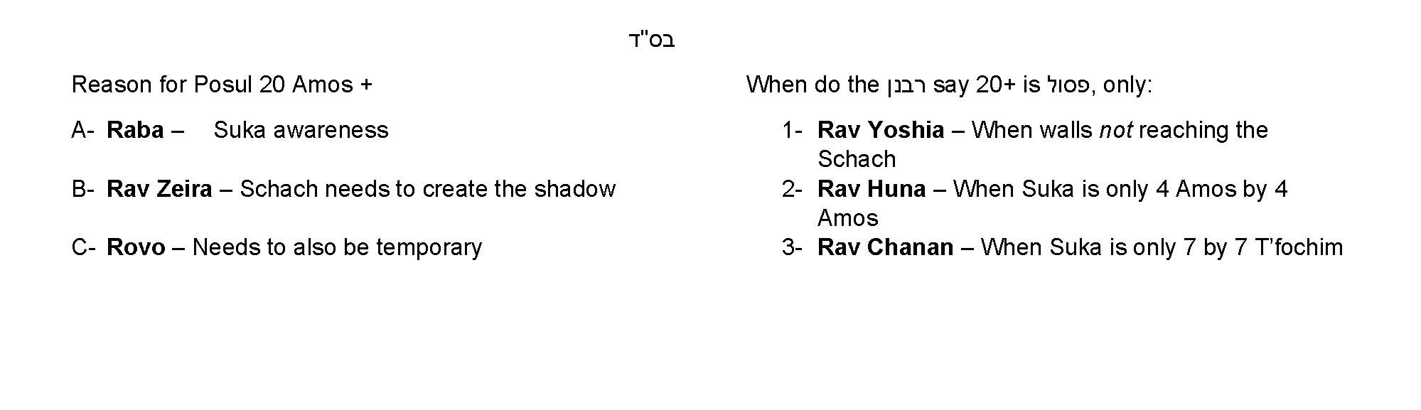 1- We created a chart to understand the 3 reasons and the three scenarios concerning the opinion of the Chachomim that a Sukkah that is 20 Amos plus is Posul.
