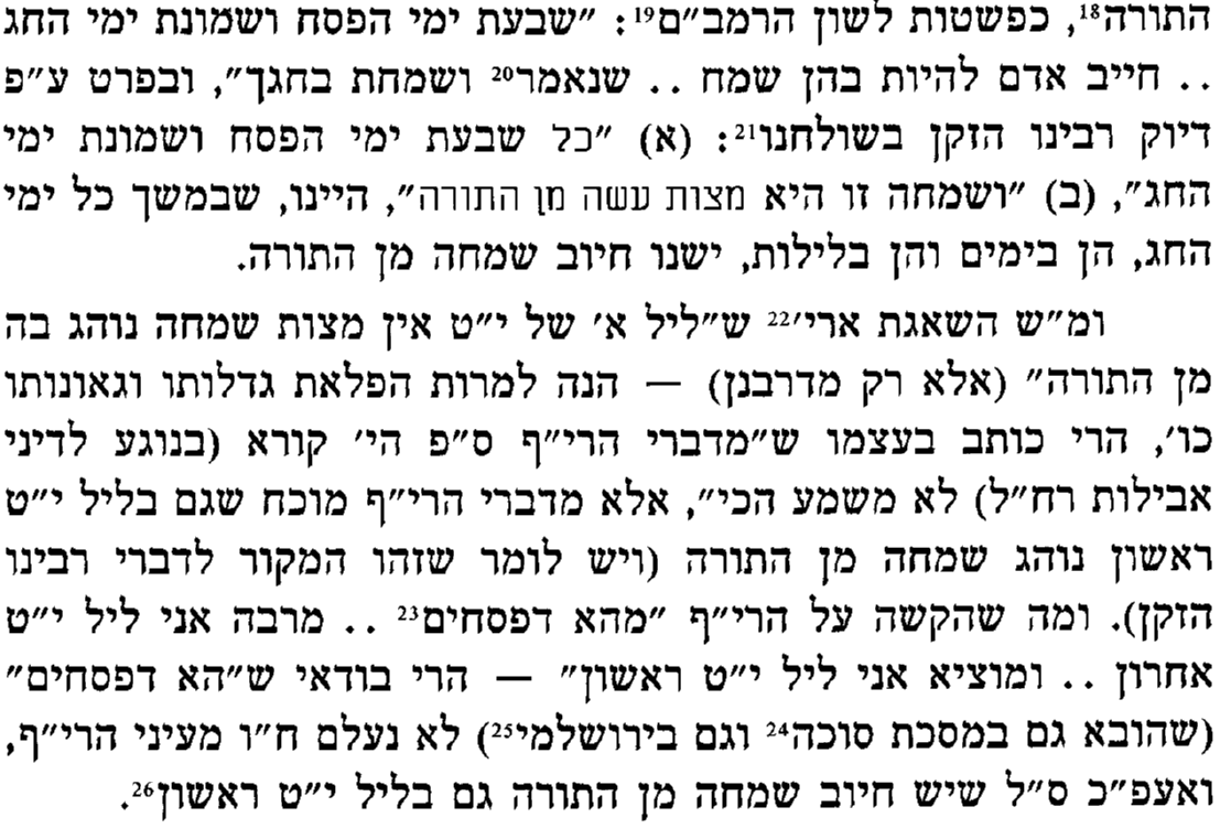 ו ויש בחול המועד מה שאין בראש השנהלו והוא שכל שבעת ימי הפסח ושמונת ימי החגלז וכן ביו”ט של עצרתלח חייב אדם להיות שמח וטוב לב הוא ובניו ואשתו ובני ביתו וכל הנלוים אליולט ושמחה זו היא מצות עשה מן התורהמ שנאמרמא ושמחת בחגך אתה ובנך ובתך וגו’: